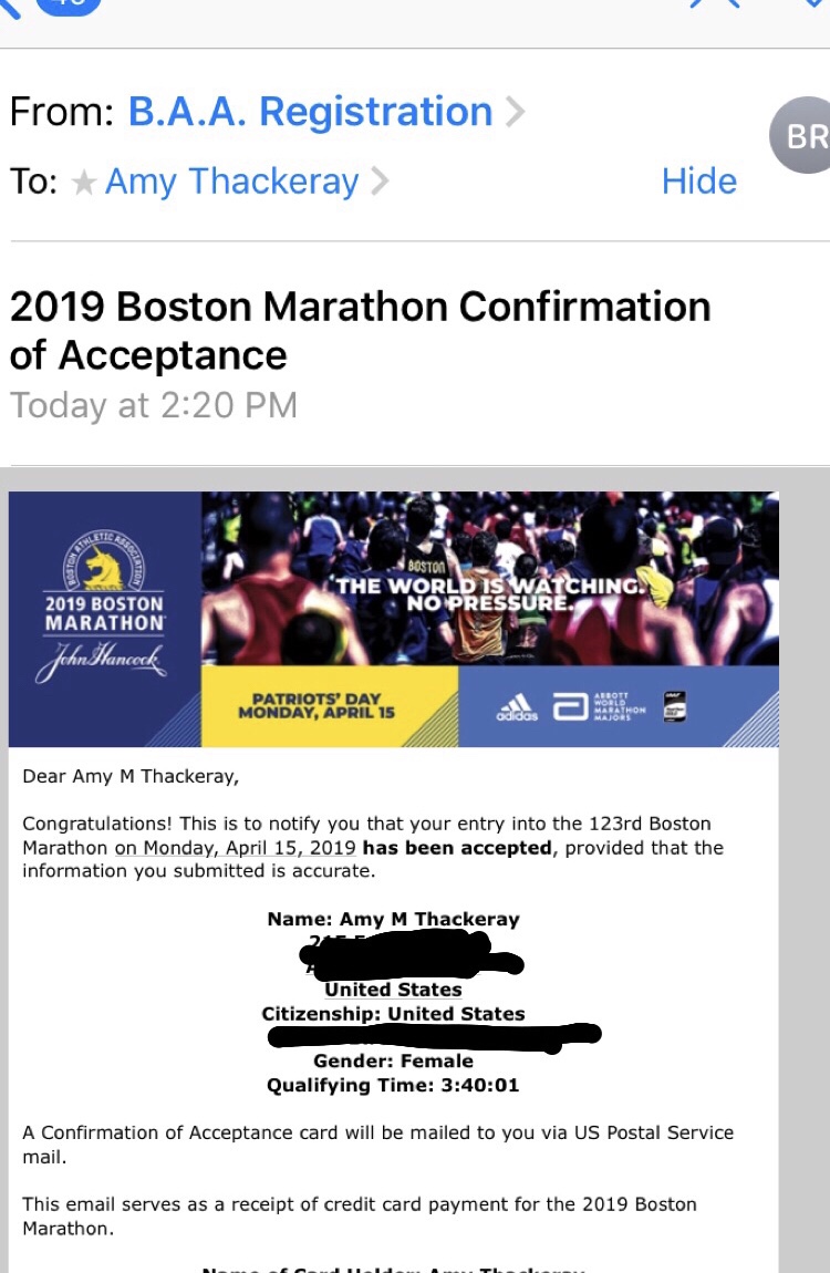 And just like that, my entry into the 2019 123rd annual Boston Marathon is official. To say I’m thrilled is an understatement.