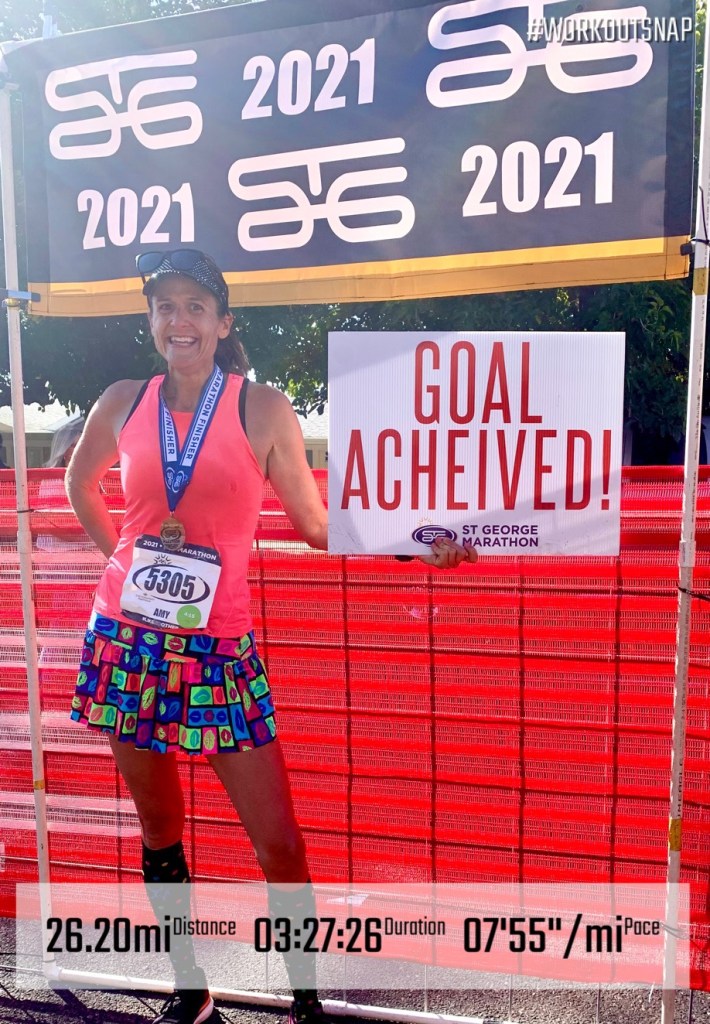 Previous Races 2021 Thankful 13 Half- Marathon- Lehi, UT November 25, 2021 1:46:15 (8:07 pace) 7th of 41 AG 40-44 Provo Haunted Half-Marathon– October 30, 2021 1:40:40 (7:41 pace) 9th of 103 AG 40-44 Salt Lake Haunted Half-Marathon- October 23, 2021 1:34:21 (7:11 pace) 3rd of 60 AG 40-44 125th Virtual Boston Marathon– October 8, 2021 3:46:27 (8:38 pace) St. George Marathon– St. George, UT October 2, 2021 3:27:26 (7:55 pace) 19th of 228 AG 40-44 *PR Pocatello Half- Marathon– Pocatello, ID September 4, 2021 1:54:59 (8:45 pacer) 3rd of 15 AG 40-44 **20 mile training run Nebo Half-Marathon- Payson, UT August 28, 2021 1:26:28 (6:36 pace) 4th of 97 AG 40-44 PC2PG Half-Marathon- August 21, 2021 1:48:09 (8:14 pace) 2nd of 15 AG 40-44 (**training run) Timp Half-Marathon- American Fork, UT July 31, 2021- 1:38:08 (7:30 pace) 2nd of 83 AG 40-44 Deseret New Half-Marathon– Salt Lake City, UT July 23, 2021- 1:50:32 (8:26 pace) 8th of 35 AG 40-44 **training run Heber Half-Marathon– Heber, UT June 26, 2021- 1:28:25 (6:43 pace) 5th of 77 AG 40-44 White Pine Solstice Trail Half-Marathon- Tooele, UT June 19, 2021 4:58:24 (4,567ft vertical gain) 4th of 6th AG 40-49 **(training run) Utah Valley Half- Marathon– Provo, UT June 5, 2021 1:37:13 (7:25 pace) 3rd of 133 AG F 40-44 Dino Half-Marathon- Vernal, UT May 8, 2021 1:36:06 (7:20 pace) 4th F Over-all, 1st of 25 AG F 40-44 KTX Half-Marathon- Kanab, UT April 24, 2021 3:49:20 14.75 miles 2,228ft vertical gain. 1st of 16 AG F 40-49 Southern Utah Half Marathon– Washington, UT April 17, 2021 1:36:06 (7:20 pace) 2nd of 46 AG F 40-44 Emigration 10-Miler– Salt Lake City, UT April 3, 2021 1:10:24 (7:07 pace) 1st Place Female Overall Riverton Half-Marathon- March, 27, 2021 Riverton, UT 1:49:34 (8:22 pace) 2nd F AG 40-44 Red Mountain 55k Ultra-Marathon– March 6, 2021 St. George, UT 8:27:15 (35.08 miles,14:28 pace) 3,929ft vertical gain Sun Half- Marathon– January 30th St. George, UT 1:40:37 (7:40 pace) 1st of 6 F AG 40-44, 5th F overall Frigid 5k– January 23rd 23:57 (7:44 pace) 3rd of 25 AG F 40-44, 13th F overall Share this: Click to share on LinkedIn (Opens in new window) LinkedIn Click to share on Pocket (Opens in new window) Pocket Click to share on Telegram (Opens in new window) Telegram Click to share on WhatsApp (Opens in new window) WhatsApp More Click to email a link to a friend (Opens in new window) Email Click to print (Opens in new window) Print Click to share on Facebook (Opens in new window) Facebook Like Loading...